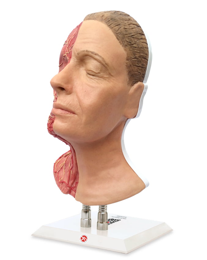 The model was designed for educational and didactic purposes to educate and improve the skills associated with performing procedures in the field of aesthetic medicine in the facial area. This version shows the muscle groups, the main arteries and nerves on one side. Perfect for education, as it allows the explanantion of the facial anatomy as well as showing the correct position for injection.